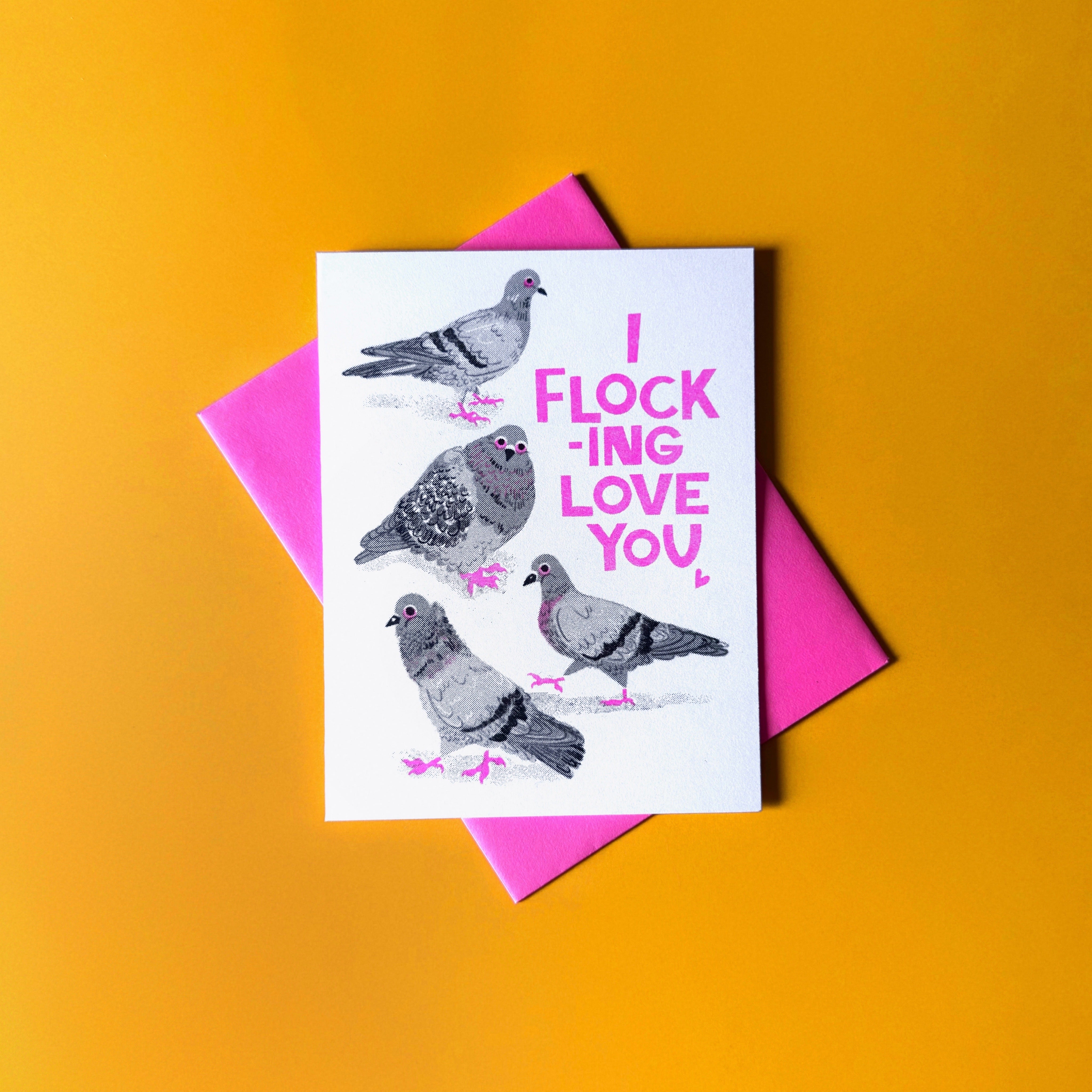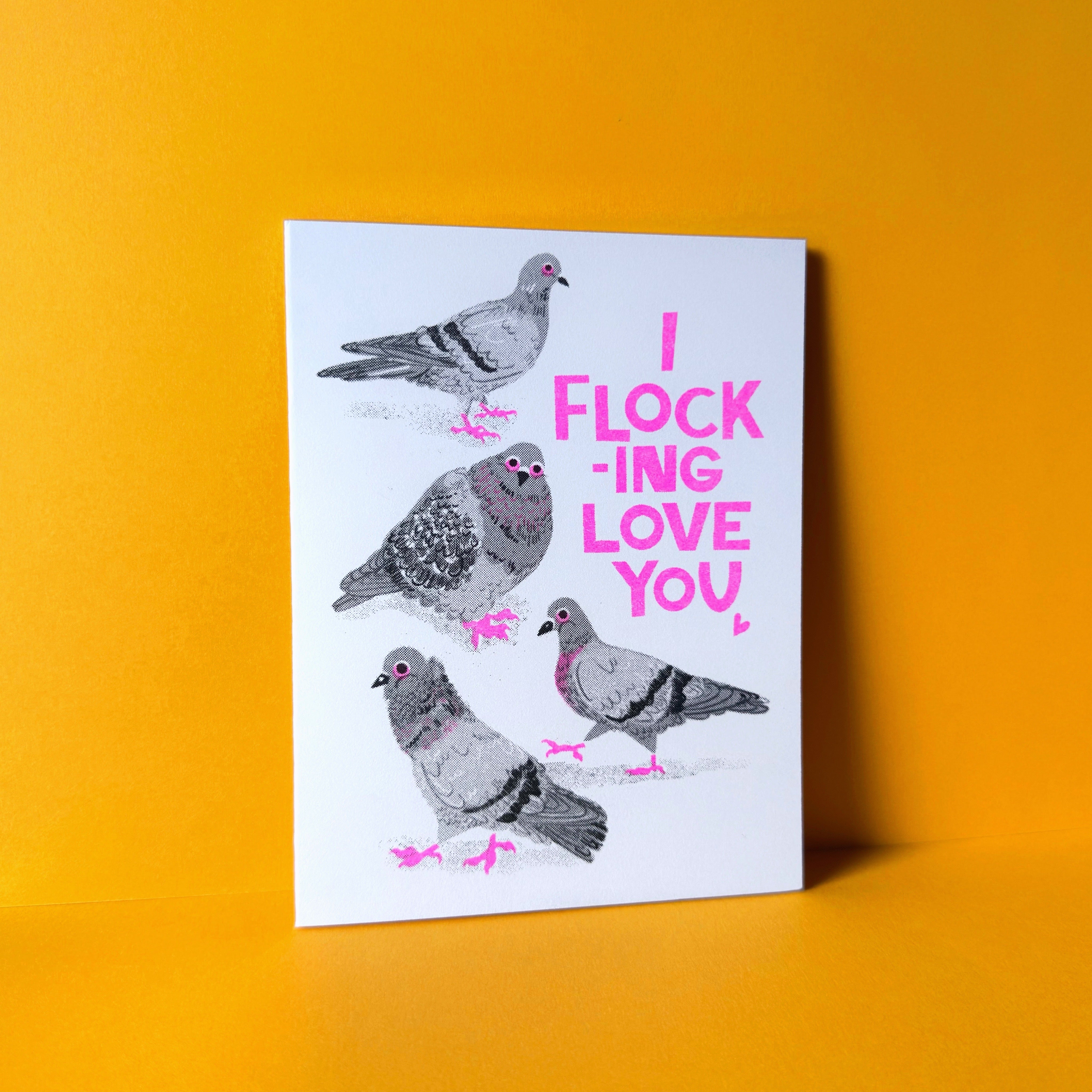 pigeon love card, pigeon risograph card, risograph love card, riso print greeting card, bird love card, pigeon illustration card, urban romance card, modern love card, quirky love card, bold color greeting card, artist made card, small batch greeting card, anniversary card, just because love card, contemporary romance card, New York City, Chicago, Boston, Philly
